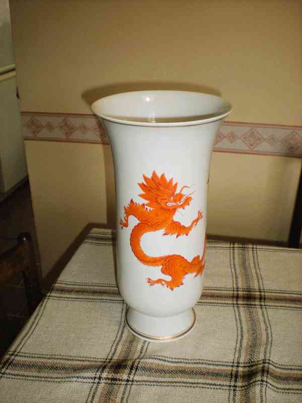 Nabízím vázu míšenský porcelán s červeným drakem a horním zlatým okrajem, výška vázy 35 cm, horní průměr 18 cm,