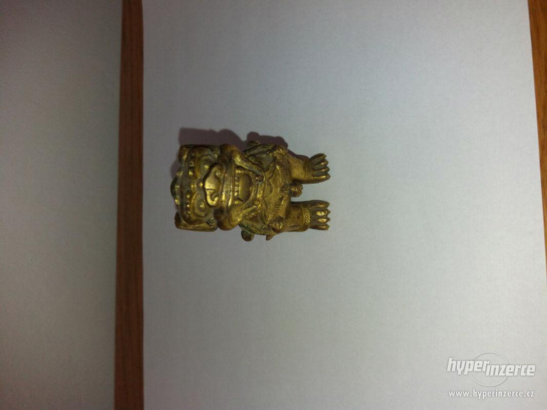 Asiatika z 16. století. Původně výzdoba chrámu. Bronz se zbytky polychromie. Velikost 6x5x3 cm, miniatura.