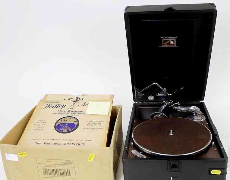 Plně funkční starožitný gramofon na kliku značky His Master’s Voice z poloviny 20. let minulého století, výrobce His Master's Voice.