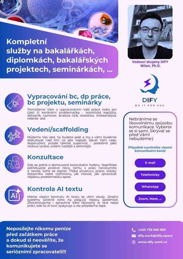 Zhotovíme Vám práci, která skutečně projde! Pomůžeme Vám se zpracováním libovolné akademické práce, od seminárních prací přes bakalářské, diplomové až po drigorózní a dizertační. Problém nemáme s žádným oborem. Jsme malý tým, který hravě všechna odvětví dokáže pokrýt. S každým se snažíme komunikovat i telefonicky tak, aby měl co nejvíce informací a byl spokojen. Úspěšnost máme 99%. Neváhejte se ozvat:)