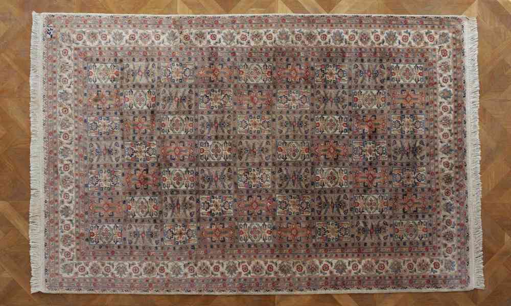 Ručně vázaný koberec z kvalitní vysokohorské vlny na bavlněné osnově. Koberec má vysokou hustotu vazby kolem 360.000 uzlíků na m2. Světlá, příjemně neutrální barevnost v tónech slonové kosti, béžové, jemné terakoty a pastelových akcentů činí koberec velmi univerzálním a snadno kombinovatelným s historickým i moderním interiérem. Koberec je signovaný, což podtrhuje jeho autorský charakter a vyšší sběratelskou hodnotu. Zajímavý kazetový vzor s květinovou bordurou.