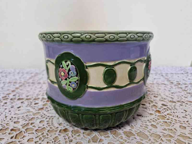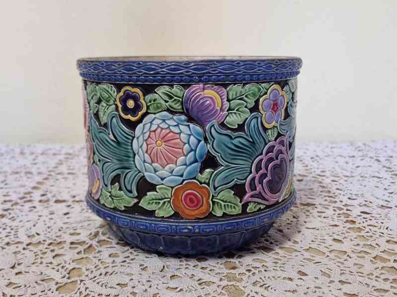Krásný secesní Květináč, malovaná glazovaná keramika, pestré barvy, Majolika - Značeno Eichwald, Dubí, kolem 1900.Rozměry: výška 15cm, průměr 19cm.