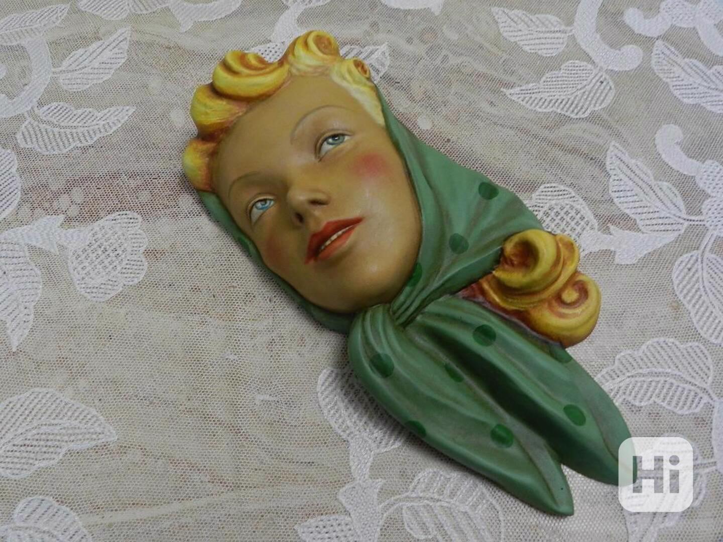 Krásná Art Deco maska na zed, Dívka v Šátku, ručně malovaná glazovaná keramika, Čechy, 1 pol. 20 stol.