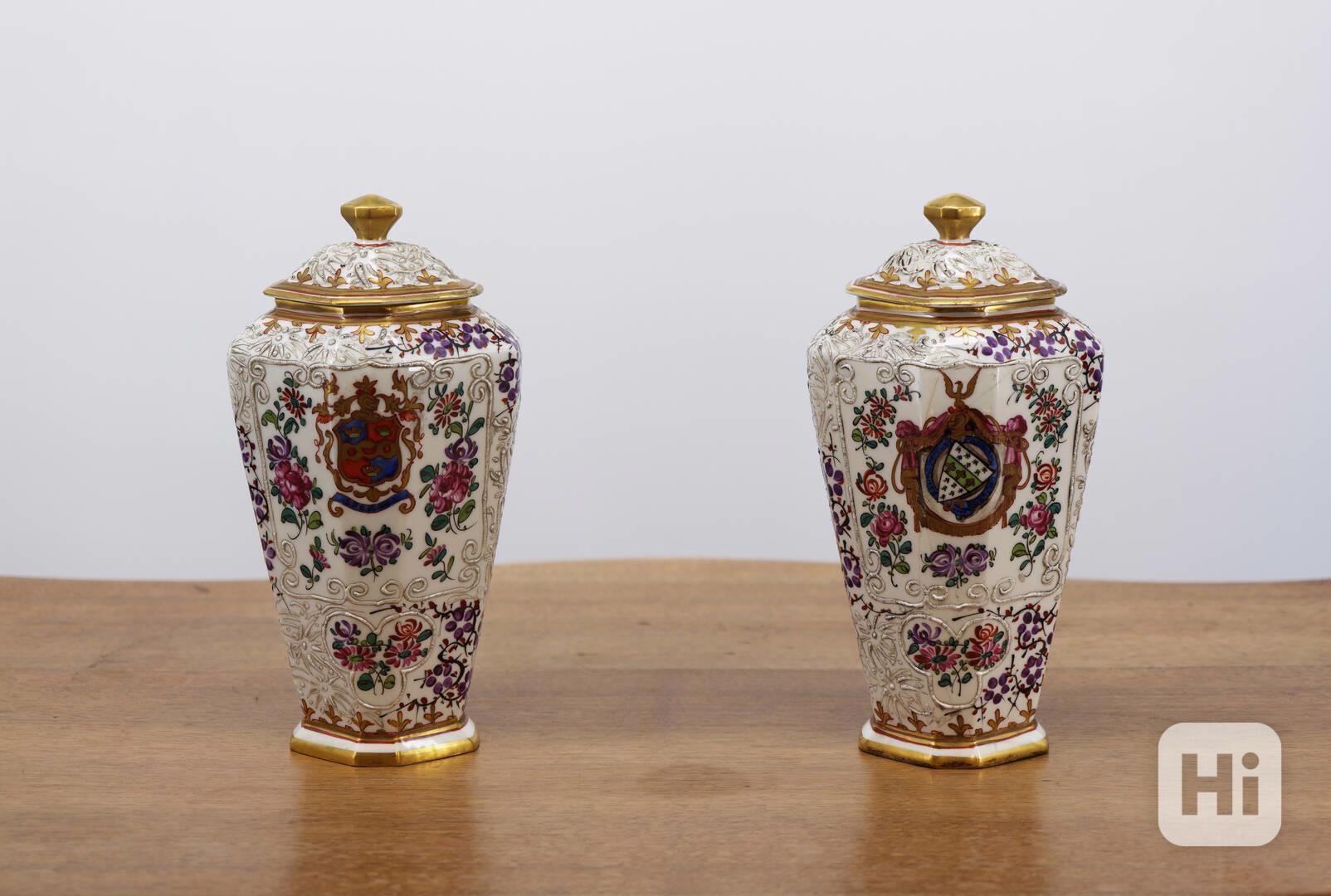 Elegantní pár porcelánových váz s víky z dílny Samson, bohatě ručně malované jemným květinovým dekorem v polychromii. Vázy mají výrazný plastický reliéfní ornament, zlacené okraje a kartuše s malovanými erby, což jim dodává reprezentativní a šlechtický charakter. Typický je mnohostěnný tvar, kvalitní porcelán a precizní ruční práce.