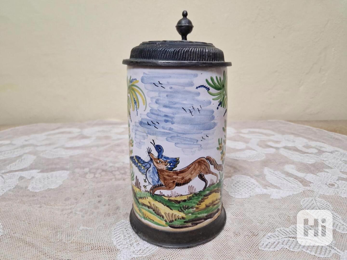 Krásný barokní kameninový Korbel s Liškou, ruční malba, cínový poklop s Josefem II! - Německo, 2 pol. 18 stol.