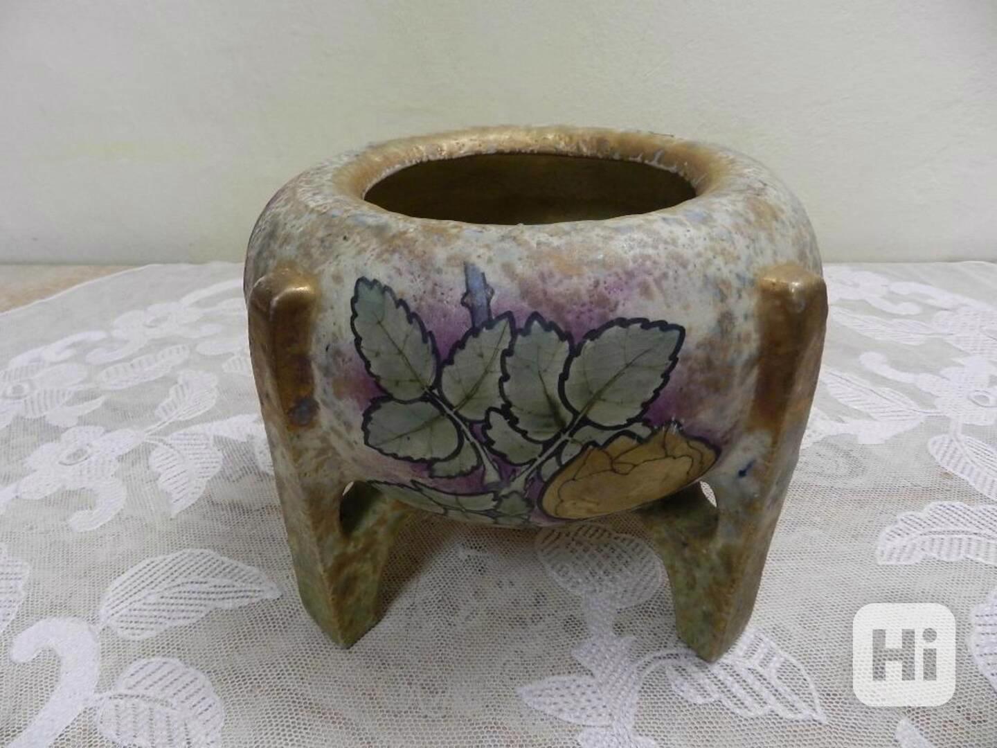 Vyjímečný secesní ručně malovaný keramický Květináč na čtyřech nožičkách, motivy květin, velmi kvalitní zpracování - značeno zespodu, Teplice, Amphora Austria, kolem 1900.