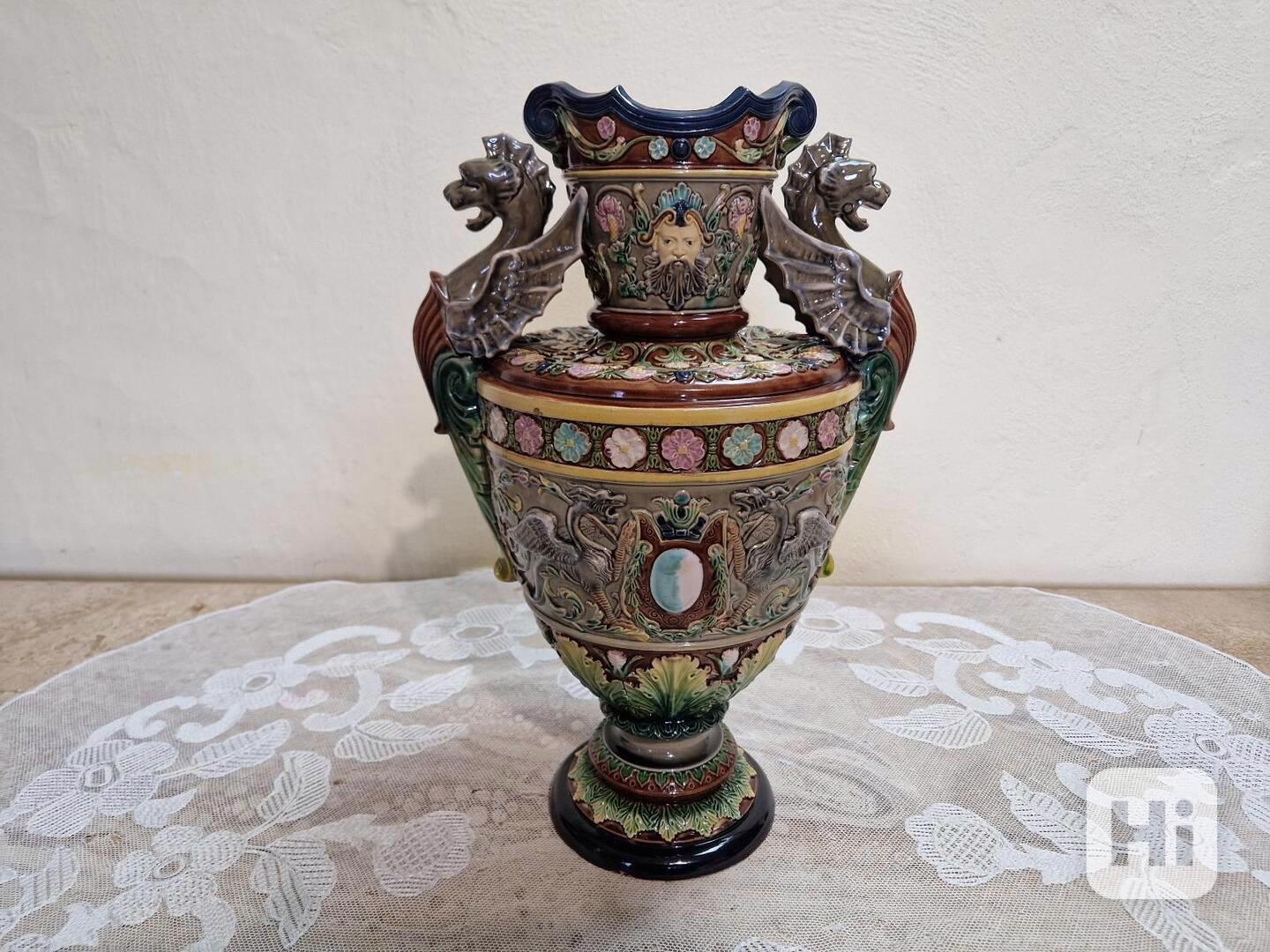 Luxusní obří figurální váza ve tvaru amfory, motivy draků, plastický reliéf, novorenesanční styl, bohaté zdobení, krásné barvy, ručně malovaná majolika, špičková kvalita - Wilhelm Schiller Horní Grund, kolem 1880.