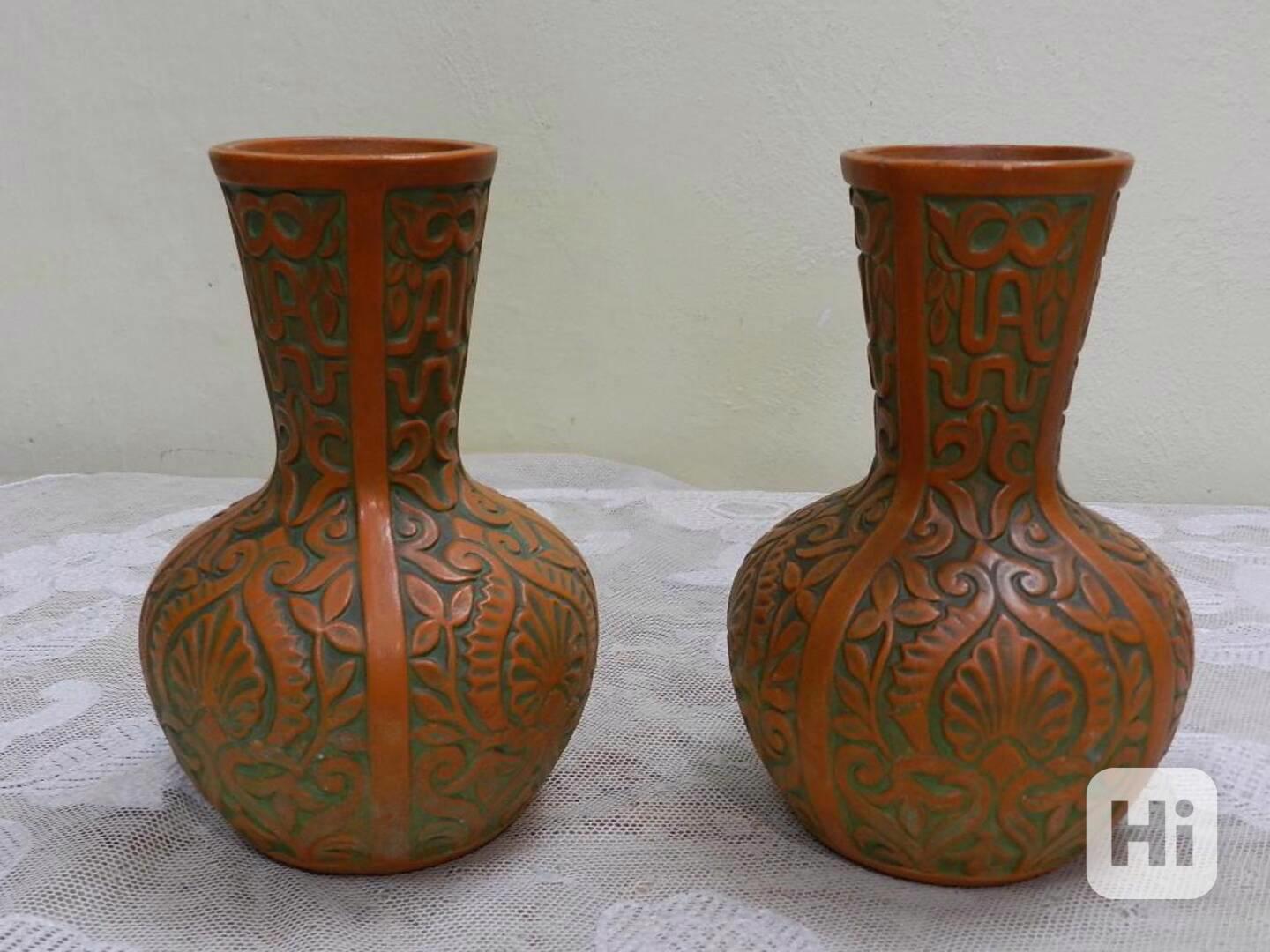 Zajímavé párové keramické Vázy, hezké bohaté zdobení, plastický reliéf - Johann Maresch, Severní Čechy, 1 třetina 20 stol.