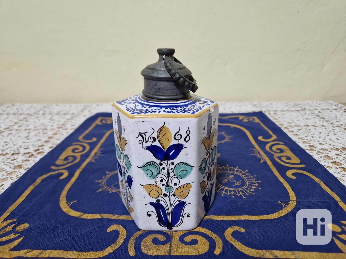 Krásná velmi stará malovaná keramická šestihranná nádoba, cínová montáž, s datací 1668. Zřejmě se jedná o pozdější kopii, přesné stáří nedokážu určit.