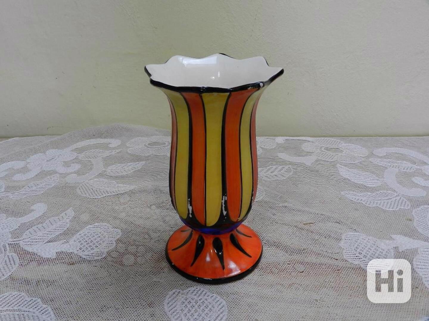 Nevídaná Art Deco ručně malovaná Váza, barvy: žlutá, oranžová, modrá, černá - Ditmar Urbach, značeno pouze Czechoslovakia.Rozměry: výška 20,5cm, šířka 12,5cm.Slušný nepoškozený stav, jen místy oloupaná barva, viz foto.