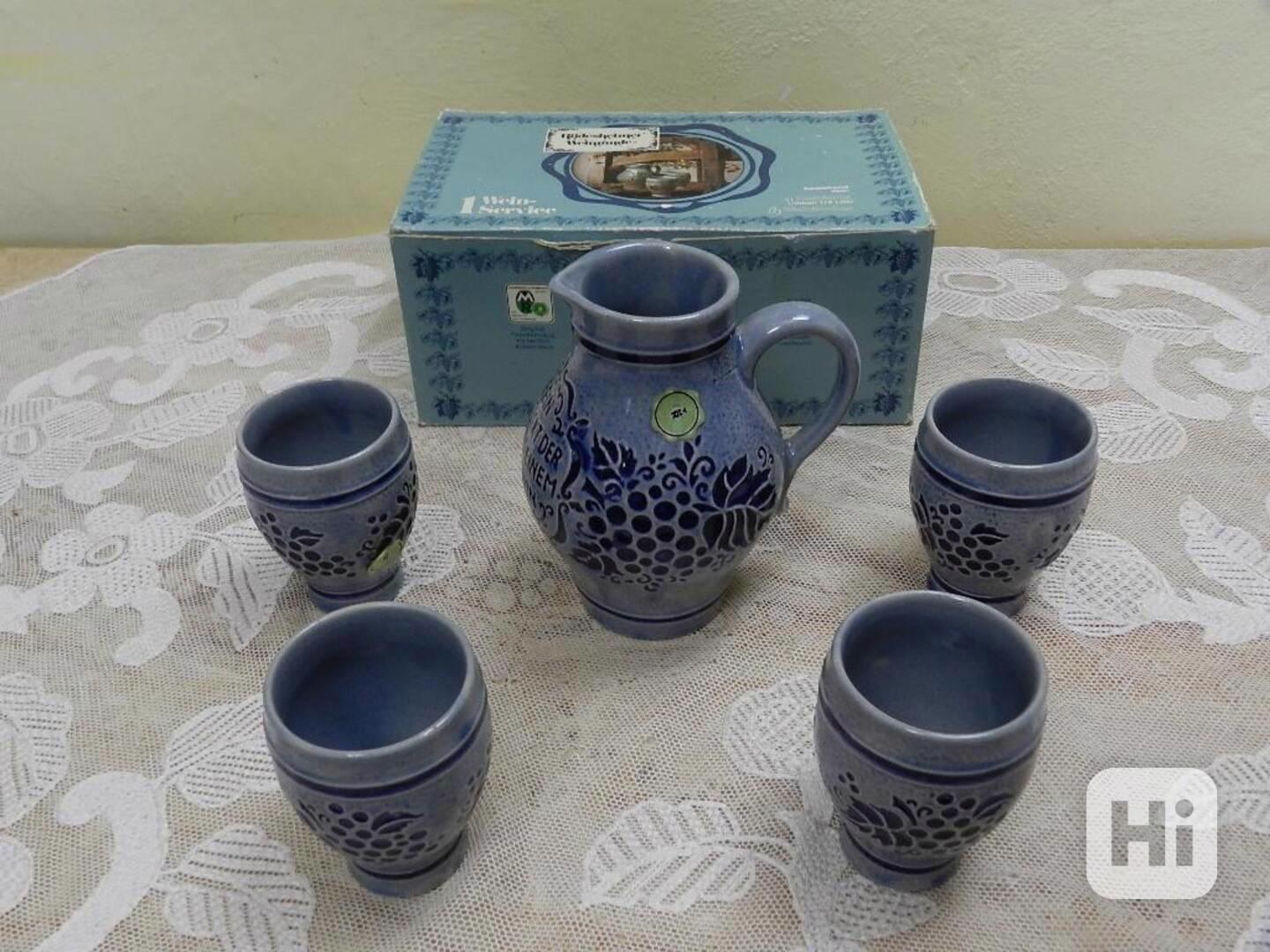 Hezká sada na víno, keramický Džbánek (cejch 0,5l) a 4 kalíšky, nepoužité, orig. krabice - Německo, 3 třetina 20 stol.