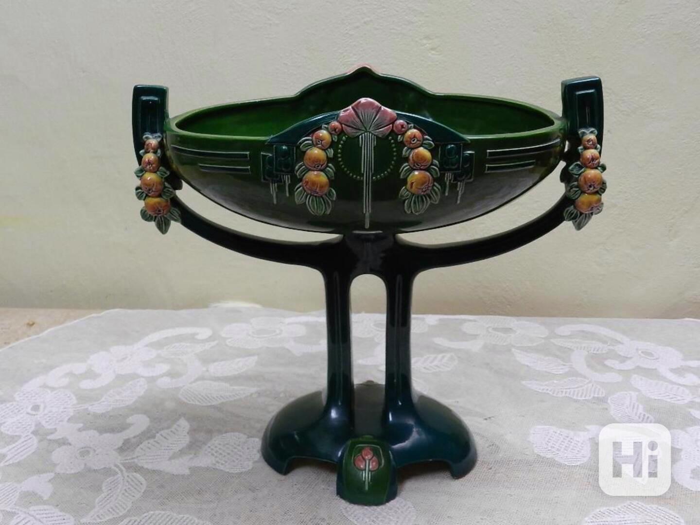 Krásný secesní keramický malovaný Nástolec, Majolika - Dubí, značeno Eichwald.