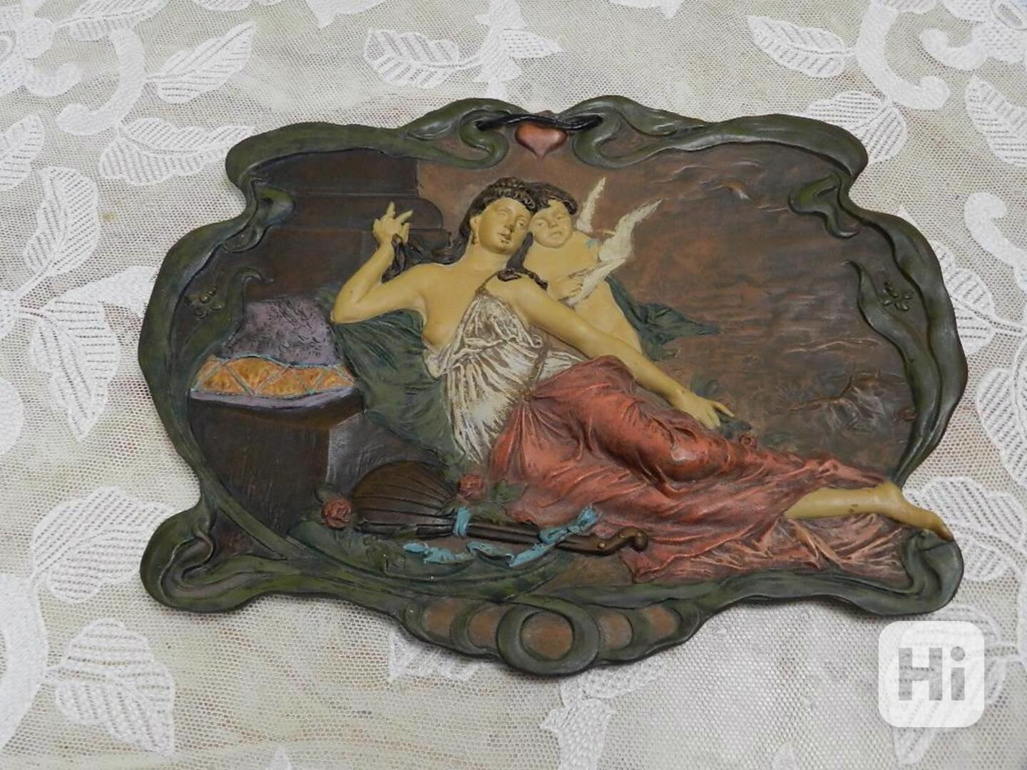 Krásný secesní reliéf, malovaná a lakovaná keramika, velmi kvalitní zpracování - značeno, Ernst Wahllis, Wien Austria, kolem 1900.