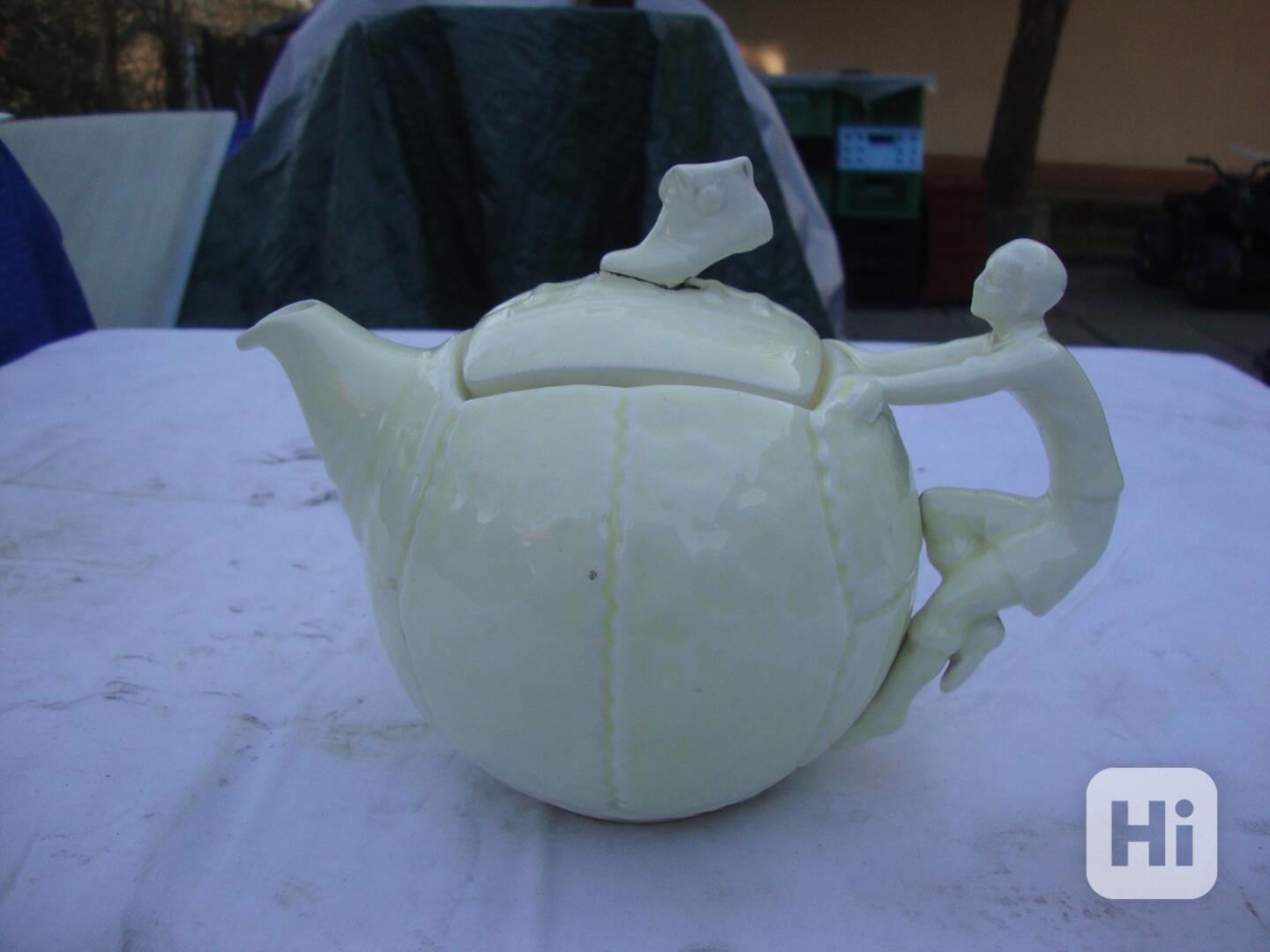 Prodám tuto starožitnou čajovou kávovou konvičku s raritním tvarem fotbalového míče, držadlo je ve tvaru fotbalisty a ouško nahoře kopačka. Výroba 1. republika, zespodu číslo 2311. Jediná vada je že horní ouško kopačka byla ulomená a je slepená, šlo by jistě ještě lépe slepit a zaretušovat, že by nešlo poznat, je to hodně stará oprava. Je to velice raritní námět, ještě jsme v tomto provedení nikdy neviděl.