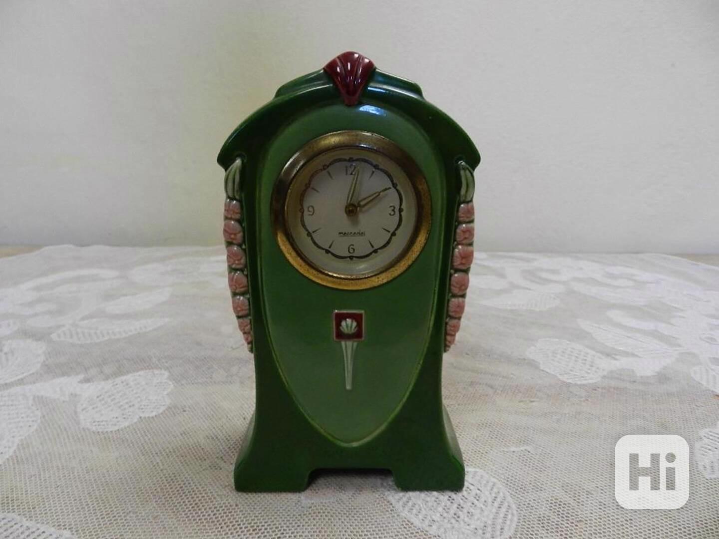 Krásné secesní stolní hodiny Mercedes, malovaná glazovaná keramika, Majolika - Dubí, Eichwald, kolem 1900.