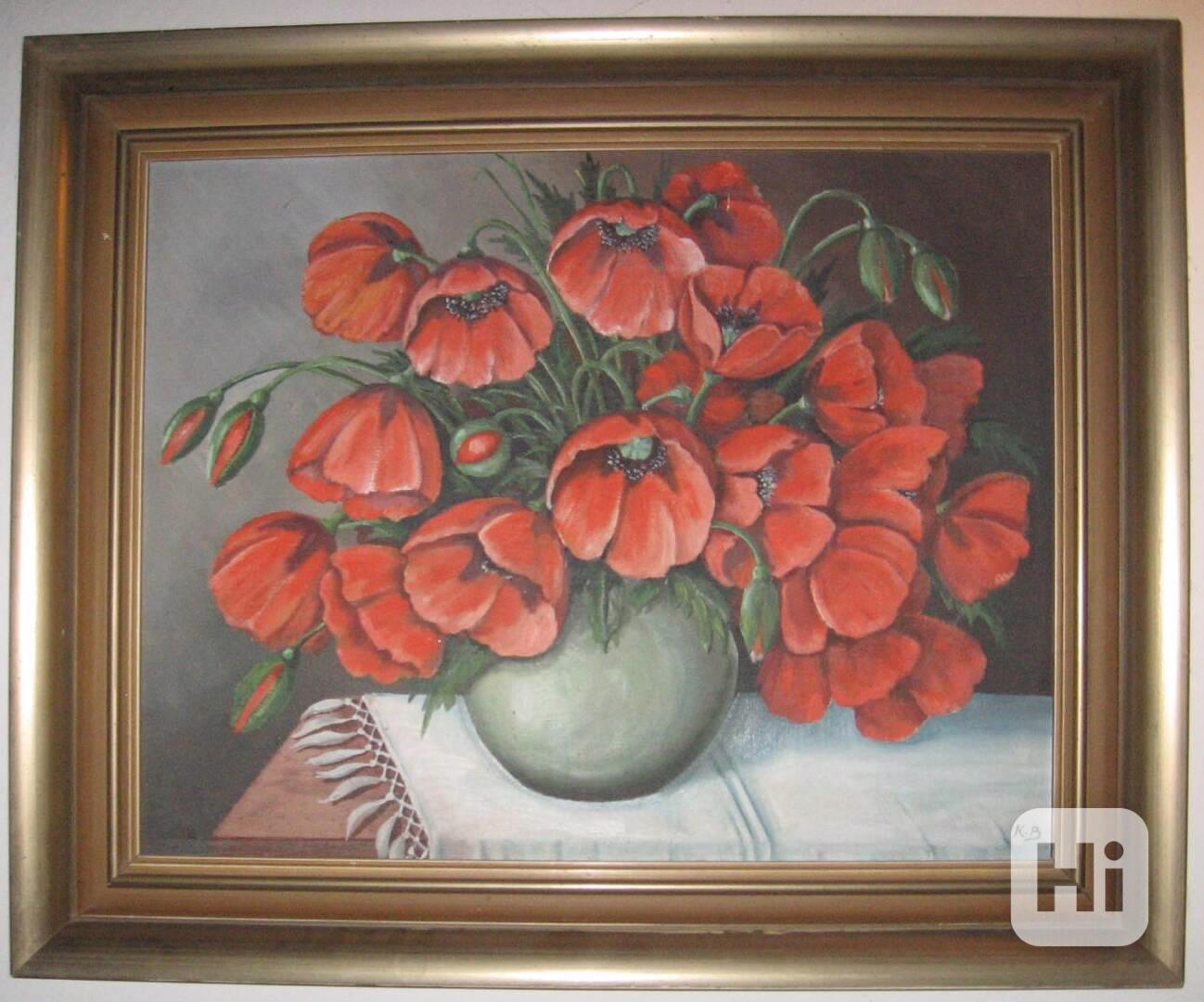nabízím obraz máky 77,5cm x 63,5cm ,malováno na desce,signováno, obraz svatý ,rozměr 106 x 63cm i s rámem ,rám místy oprýskaný , v dolní části v desce prasklina,obraz malováno akryl zaskleno rozměr 62cmx 47 cm cenu nabídněte
