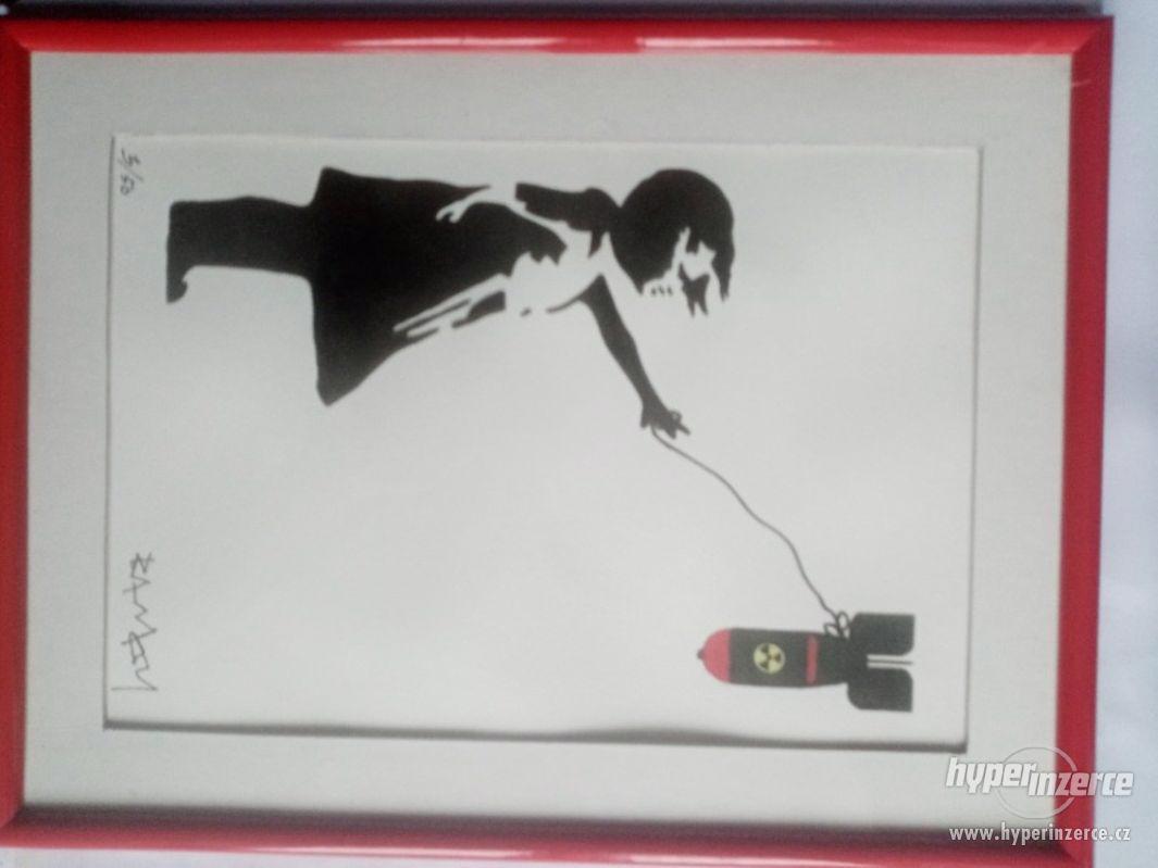 Prodám litoofset od Banksyho, 3 tisk z padesáti tisků, velikost 33x22 cm, zaskleno, rámováno, vzadu certifikát s hluchou ražbou.