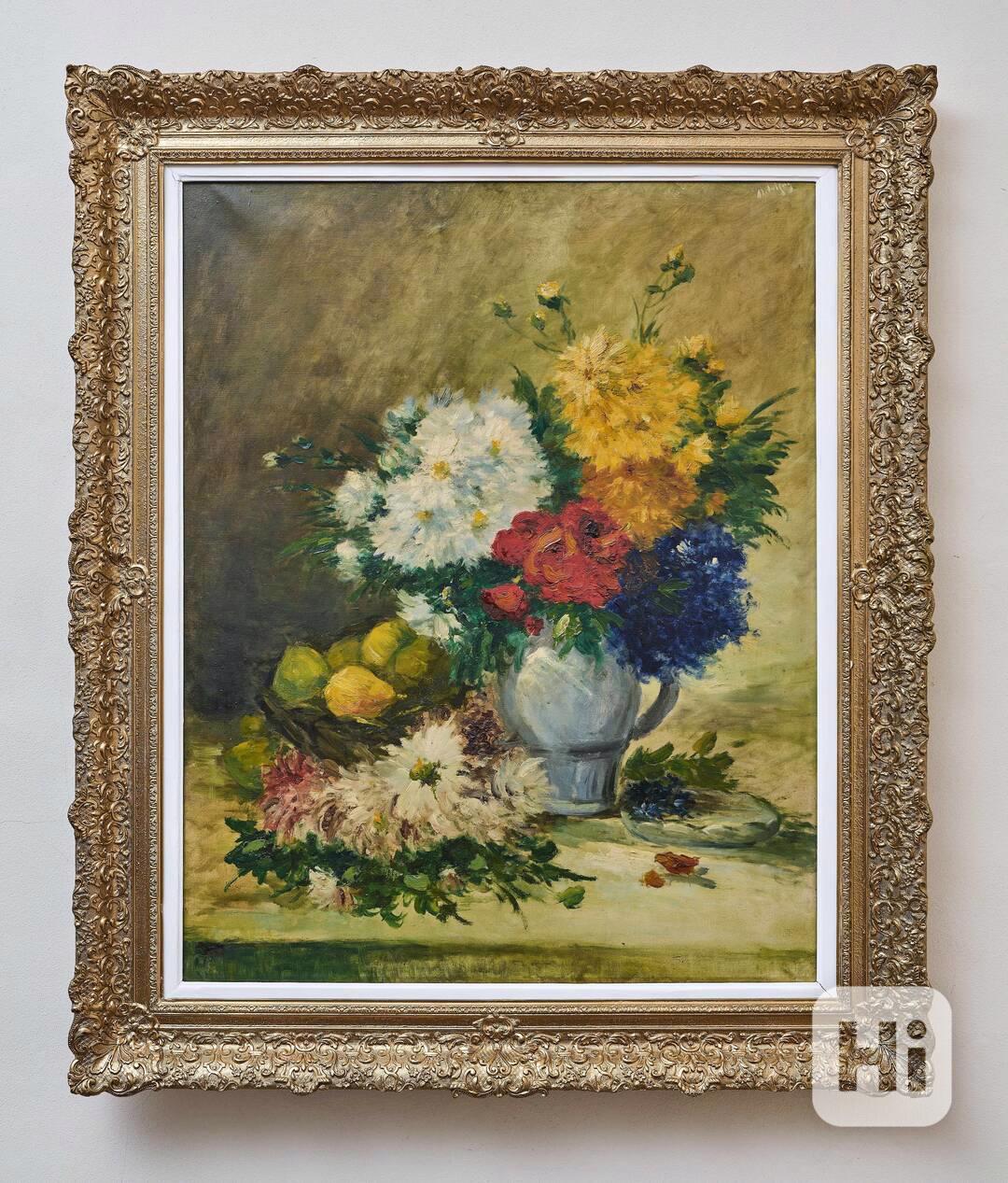 Malba je zasazena do bohatě zdobeného rámu s plastickým zlaceným dekorem, který podtrhuje její reprezentativní charakter. Celkový dojem díla je klidný a harmonický, a přitom plný života a barevné energie. Takto laděné zátiší představuje nejen esteticky působivý prvek, ale i výraz klasického malířského mistrovství, které zůstává nadčasové.