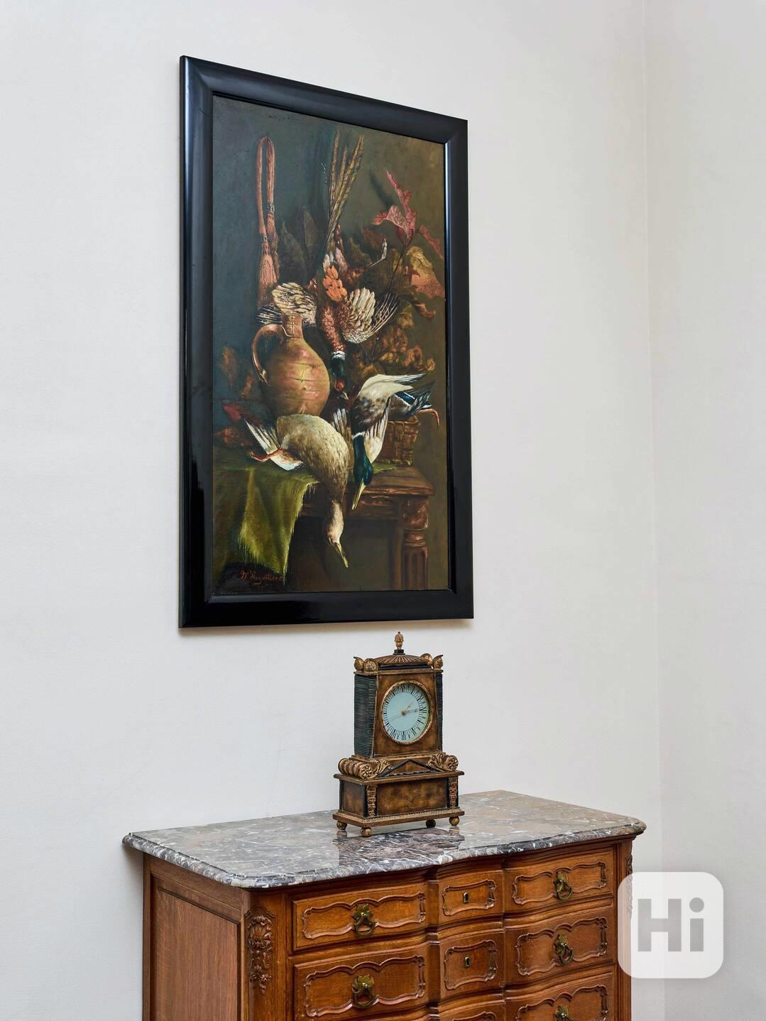 Monumentální olejomalba na plátně typická pro vlámské lovecké zátiší. Kompozice s bohatě modelovanými kachnami a drobnou zvěří, doplněná keramickou nádobou a podzimními listy, vychází z tradice nizozemské a vlámské malby 19. století inspirované staršími mistry. Malíř pracuje s temným pozadím, kontrastním světlem a výraznou strukturou barevné vrstvy, která dodává dílu hloubku a živost.