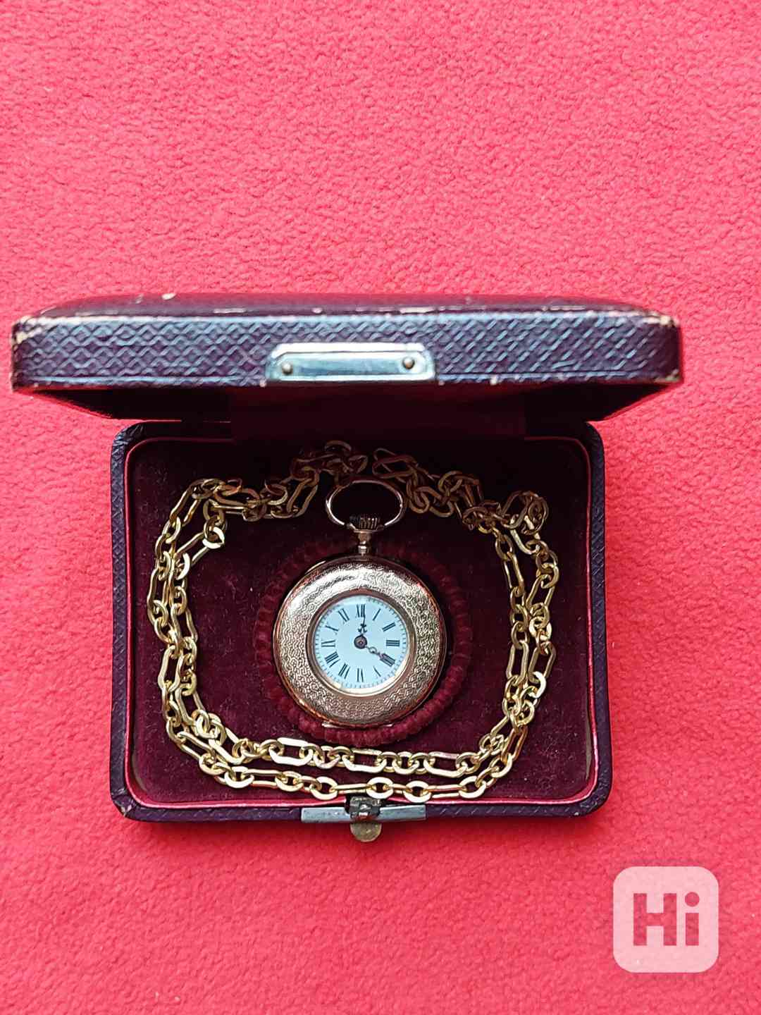 Zlaté dámské hodinky cca 120 let staré (Rakousko-Uhersko), hmotnost 22,4 gramů, puncováno - ryzost 14 karátů, průměr hodinek cca 30 mm. Hodinky jsou zlaté, řetízek pozlacený.