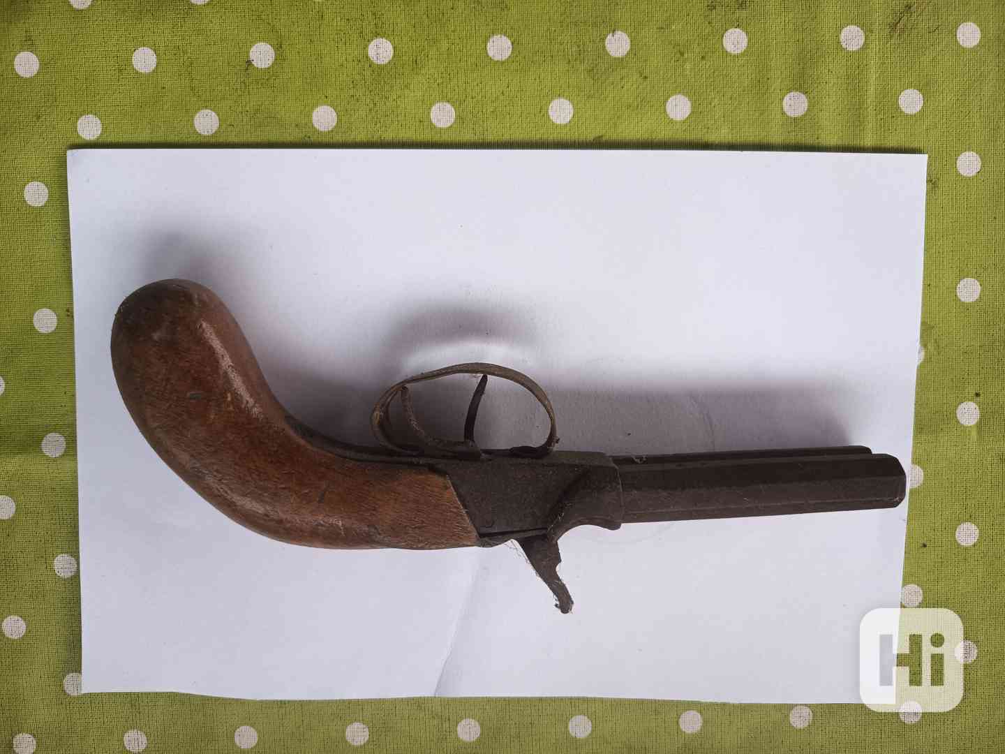 Nabízím k prodeji dvouhlavňovou perkusní pistoli. Jeden úderník je zlomený.
