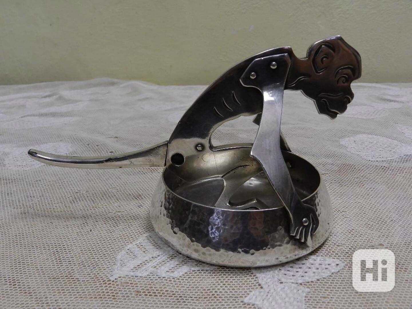 Zajímavý kovový ručně tepaný popelník či miska, ocas je pohyblivý, slouží k odříznutí špičky doutníku, velmi kvalitní zpracování, 1 čtvrtina 20 stol.