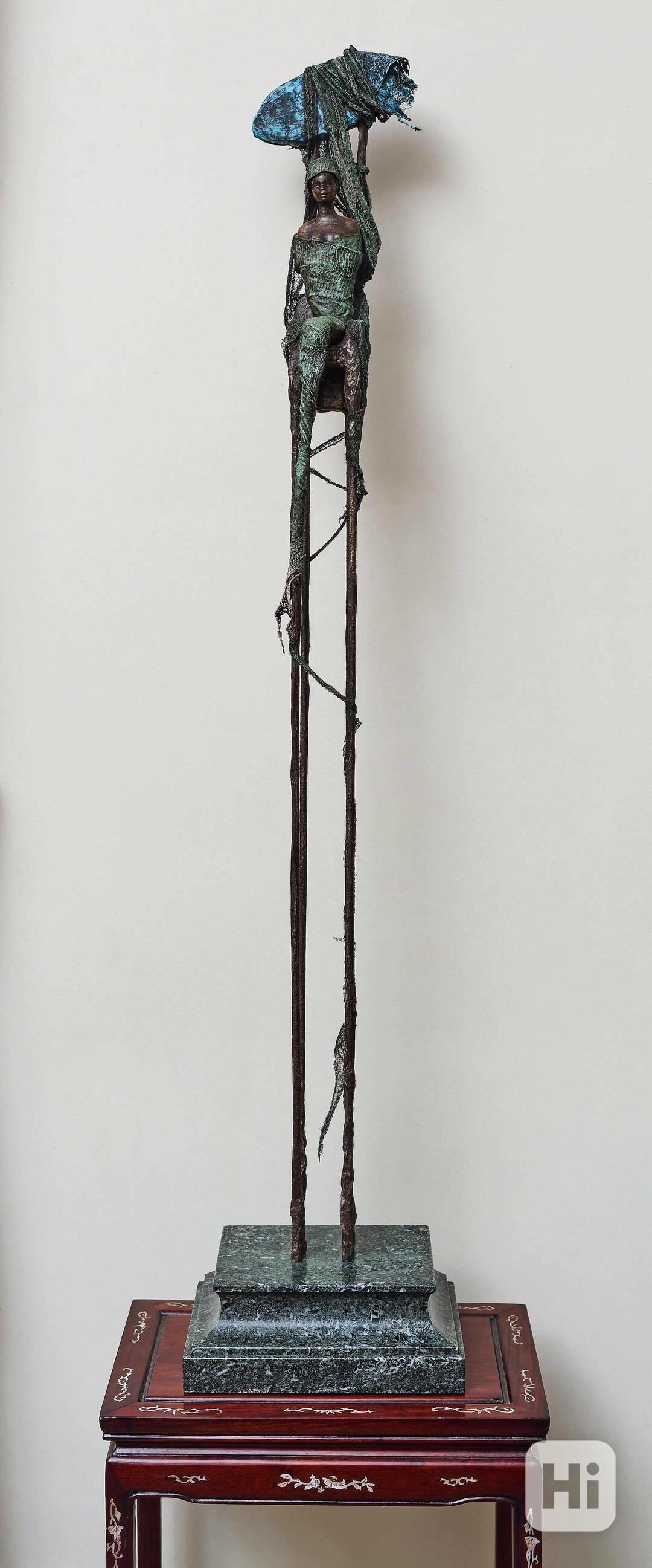 Výrazná moderní plastika vyobrazující ženskou postavu posazenou na vysoké, subtilní konstrukci připomínající dlouhé větve nebo dřevěné tyče. Socha kombinuje kovový materiál s dynamickou zelenou a tyrkysovou patinou. V horní části nese žena textilní strukturu, která přechází do organických tvarů a vytváří bohatý plastický efekt. Patina ve škále zelených a modrých tónů podtrhuje rukopis současné sochařské tvorby.
