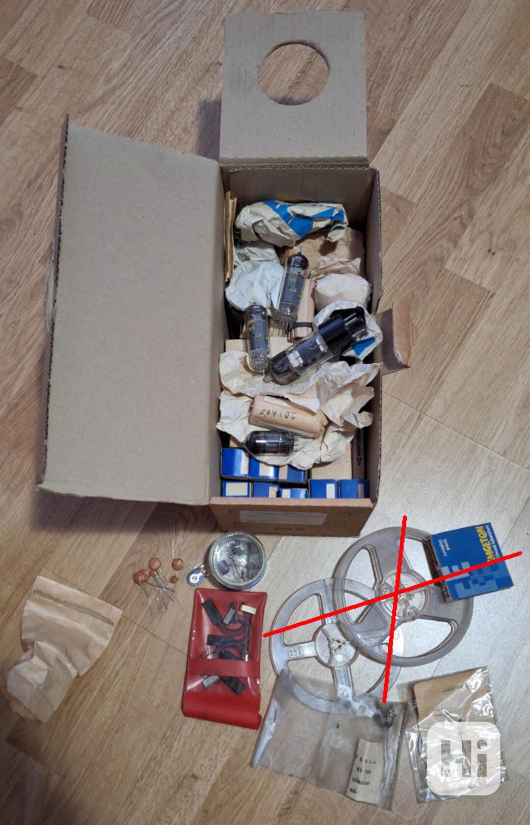 Elektronky a další součástky asi převážně pro opravy retro magnetofonů a rádií. Již prodáno: 4x kotouče s nahrávacím drátem (pro drátofon), 3x zaváděcí magnetofonové pásky (šířka 6,35 mm) a 2x plastové navíječe magnetofonové pásky (šířka pro pásku 8,7 mm) - vše prodané je na fotkách červeně přeškrtnuto nebo označeno v seznamu součástek jako "PRODÁNO". Funkčnost u většiny součástek nemám jak otestovat, ale vše bylo pečlivě zabaleno často i v originálních obalech bez viditelného poškození/opotřebení. Počty a typy většiny součástek lze vidět na doplněných fotkách a seznamech. Cena dohodou (nabídněte) - "množstevní" slevu můžeme vždy dojednat (zejména vezmete-li většinu/vše v inzerátu).