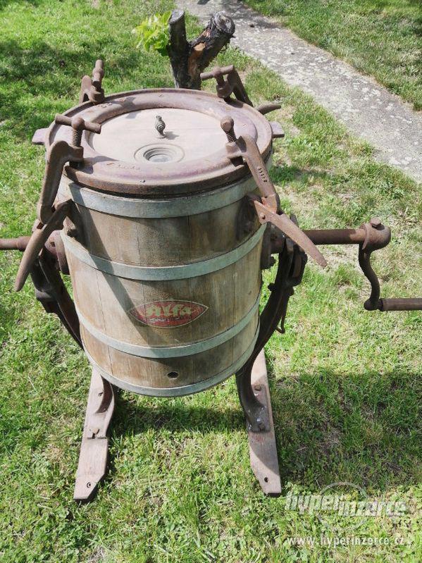 Prodám starožitnou máselnici. Vše v původním stavu. Celkový stav dobrý. Rozměry: výška 120cm, šířka 115cm. Rozměry sudu: výška 70cm, šířka 50cm. Na sudu je původní logo výrobce viz foto. Cenu prosím nabídněte.