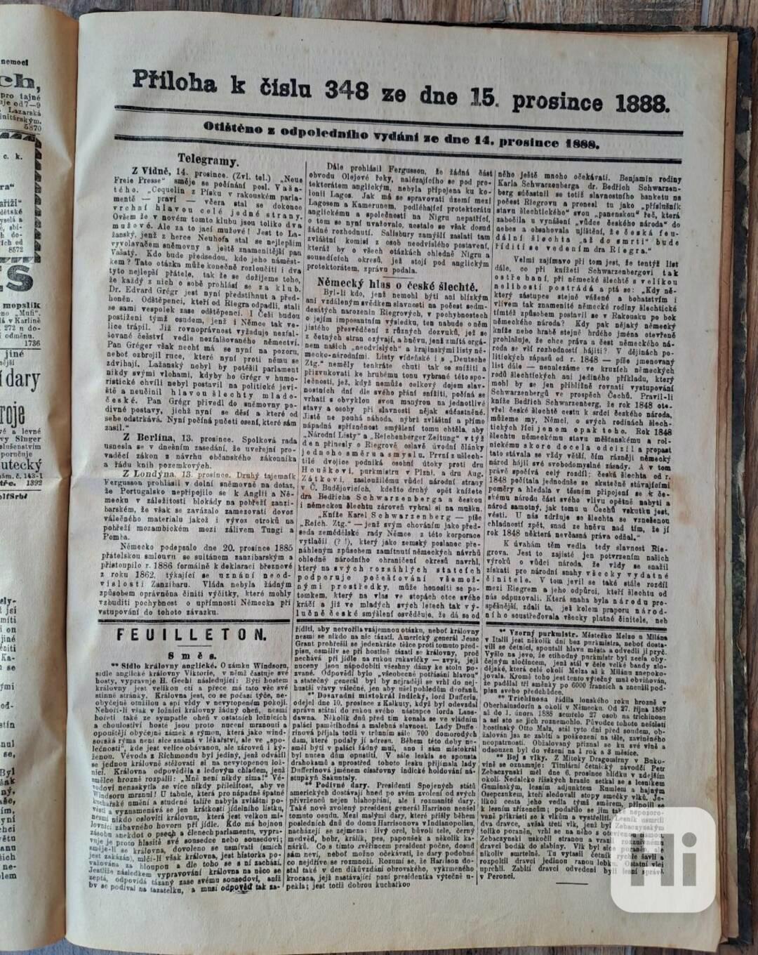 Prodám přílohy českých novin Národní politika - odpolední vydání, od čísla 76 ze dne 16.3.1888 až k číslu 348 ze dne 15.12.1888, svázané, stav dobrý. Cena 1490 Kč + poštovné.