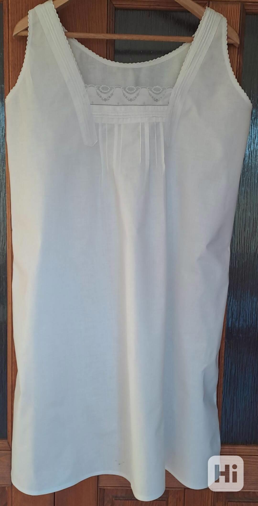 Prodám starou dámskou noční košili, bílá s šedou výšivkou u výstřihu, slabší plátno, bez rukávů, moc hezká, chybí knoflíček na rameni. Délka cca 100 cm, hrudník-podpaží 54 cm, dole 85 cm, průramek obvod 45 cm. Na ramenou zapínání na knoflík. Cena 360 Kč + poštovné.