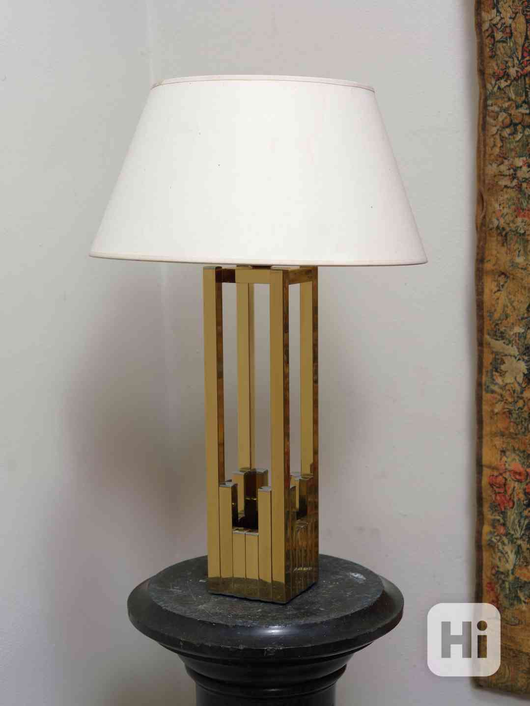 Tato stolní lampa byla navržena Willym Rizzem v 70. letech 20. století pro firmu Lumica a představuje výrazný příklad luxusního designu své doby s jasně sochařským pojetím. Monumentální, architektonicky pojatá konstrukce je tvořena kombinací chromovaného a zlaceného kovu v dvoubarevném provedení, které vytváří výrazný vizuální kontrast a umocňuje plastický charakter celé formy.