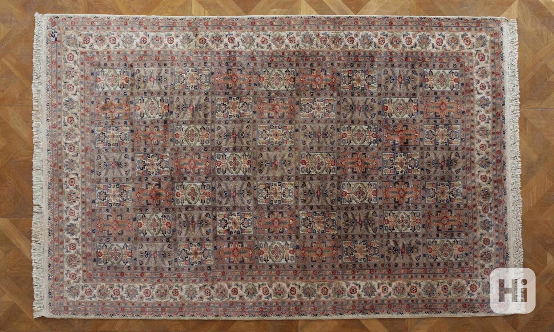 Ručně vázaný koberec z kvalitní vysokohorské vlny na bavlněné osnově. Koberec má vysokou hustotu vazby kolem 360.000 uzlíků na m2. Světlá, příjemně neutrální barevnost v tónech slonové kosti, béžové, jemné terakoty a pastelových akcentů činí koberec velmi univerzálním a snadno kombinovatelným s historickým i moderním interiérem. Koberec je signovaný, což podtrhuje jeho autorský charakter a vyšší sběratelskou hodnotu. Zajímavý kazetový vzor s květinovou bordurou.