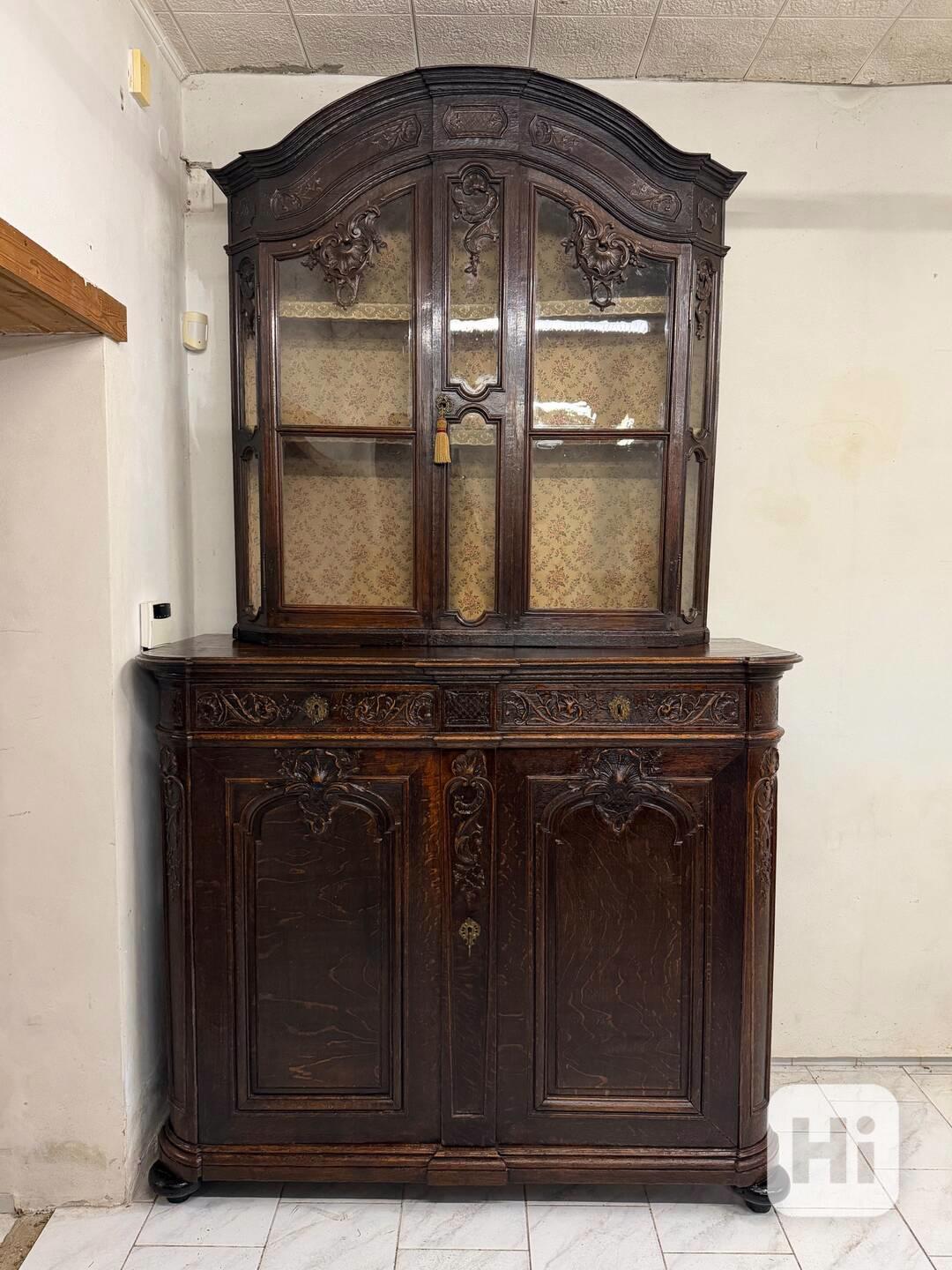Starožitný zámecký příborník ● impozantní kus nábytku ● bytelný ● bohatá řezbovaná výzdoba průčelí ● masivní tmavé dubové dřevo ● velké prosklené dveře ● původní zámky a kování ● 4x klíč ● dominantní kus do velké jídelny ● styl pozdní historismus, neorokoko ● původ Francie ● datace konec 19. století ● složený ze 2 částí ● lze kompletně rozebrat na několik částí - velmi neobvyklé ● na fotografie se nepodařilo zachytit celkový objem z příborníku. Jedná se o velmi mohutný kus, který ve skutečnosti vypadá mnohem majestněji