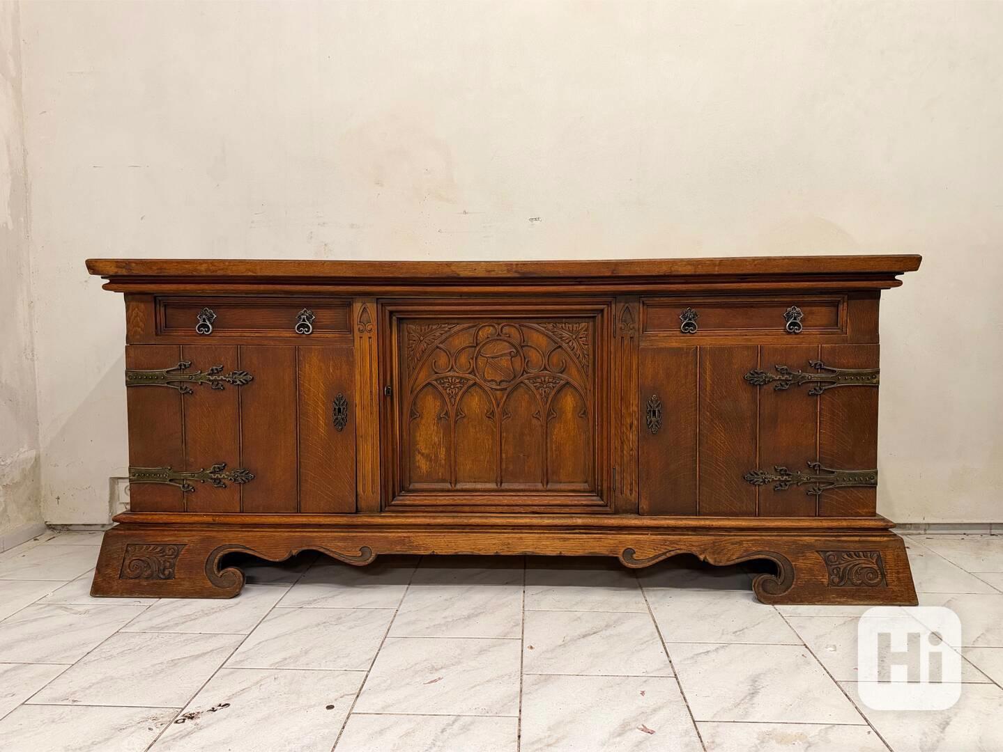Starožitný bufet v novogotickém stylu ● jemně zdobený ● spousta úložného prostoru ● inspirovaný novogotickým slohem ● původ Holandsko ● vyroben ve třetí čtvrtině dvacátého století