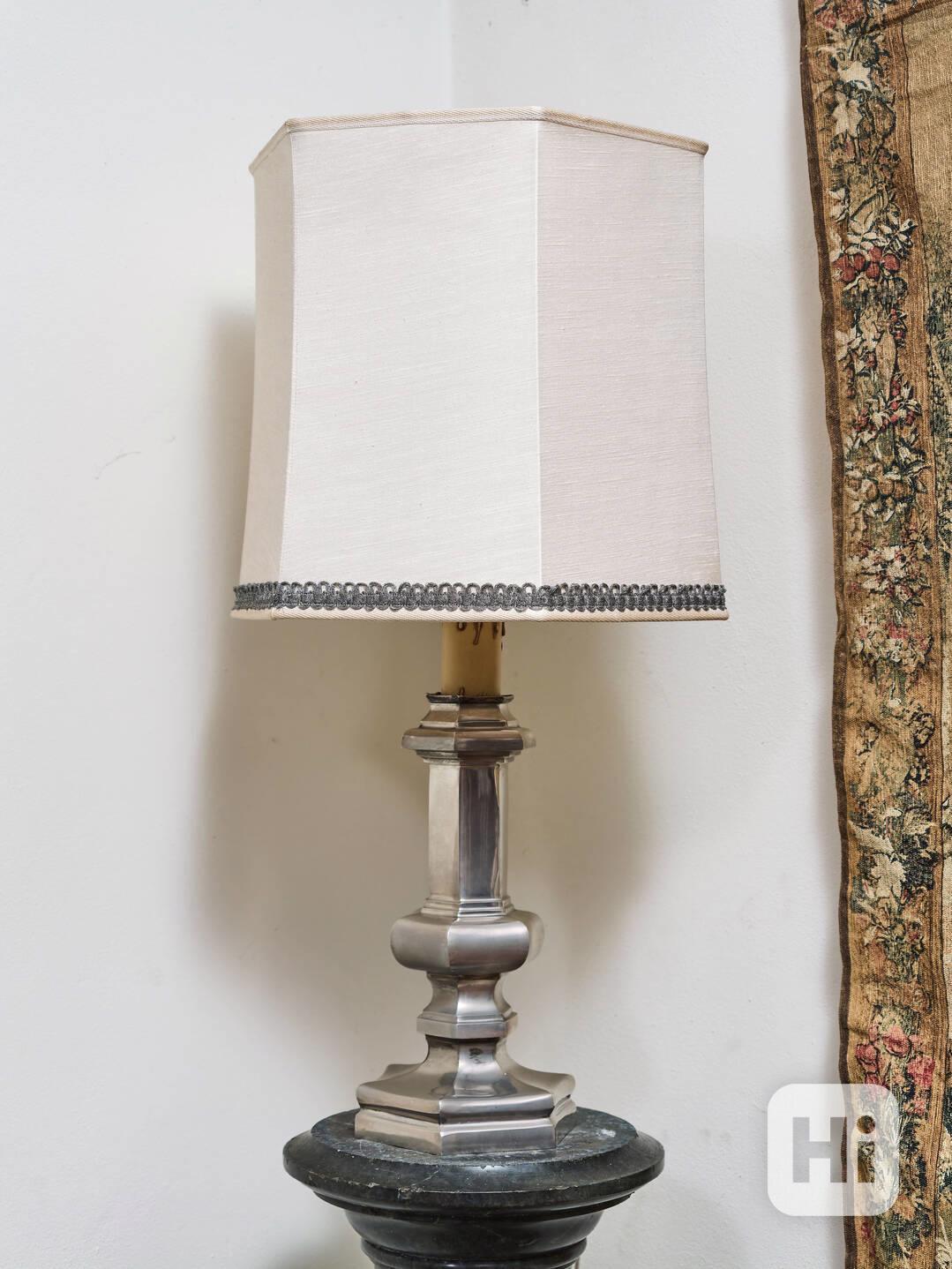 Lampa je osazena textilním stínidlem šestibokého půdorysu v neutrálním světlém odstínu, lemovaným decentní ozdobnou portou, která podtrhuje elegantní charakter předmětu. Elektrifikace je plně funkční a citlivě přizpůsobená původnímu charakteru lampy.