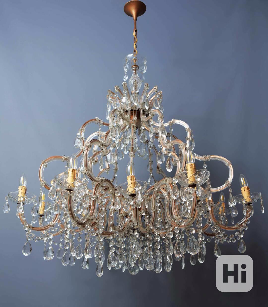 Honosný křišťálový lustr Marie Terezie na 17 žárovek do 40W. Ručně broušené a leštěné ověsy s vysokým barevným odleskem rozzáří interiér mnoha barvami. Tělo lustru je vyrobeno z kovu v bronzovém odstínu, na lustru jsou použity kabely v bronzové barvě. Misky jsou broušené s očky pro zavěšení ověsů. Lustr je vhodný do klasického i moderního interiéru jako solitérní kus. Lustr je na 17 žárovek s paticí E14 (normální svíčkové) - vhodné jsou normální, halogenové i led žárovky - nejsou součástí, ale po dohodě mohu dodat s žárovkami dle přání. Stav: lustr je nově elektrifikovaný do mědi, nový přívodní kabel s látkovým opletem 3 linka s uzemněním, jsou doplněné ověsy, nové objímky žárovek a nové šešule - v perfektním stavu. Datace: 20. století. Provenience: Čechy.