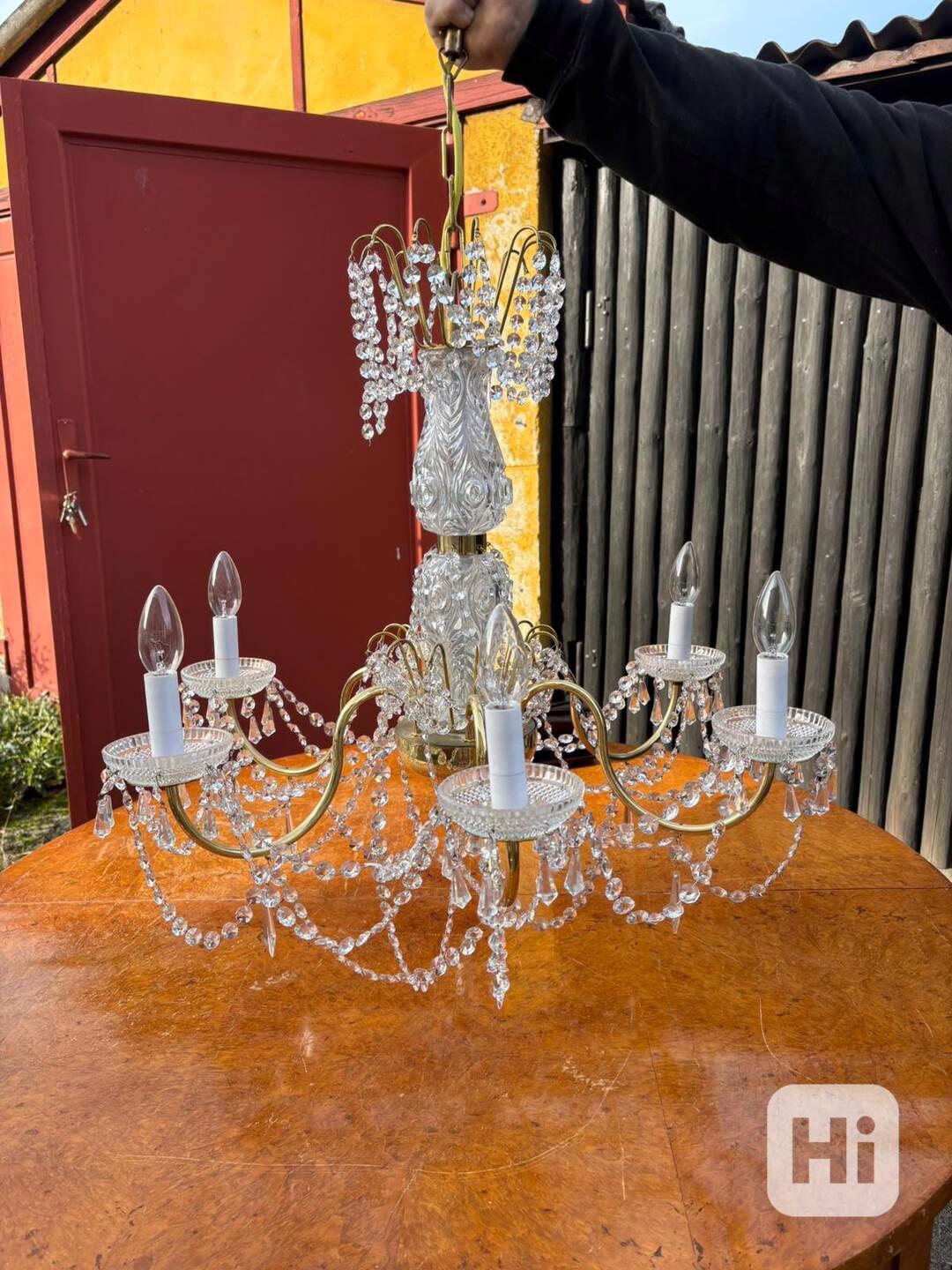 Prodám skleněný lustr, šestiramenný, kovová ramena, skleněné talířky a skleněné tělo lustru, 1980, styl Maria Theresa.