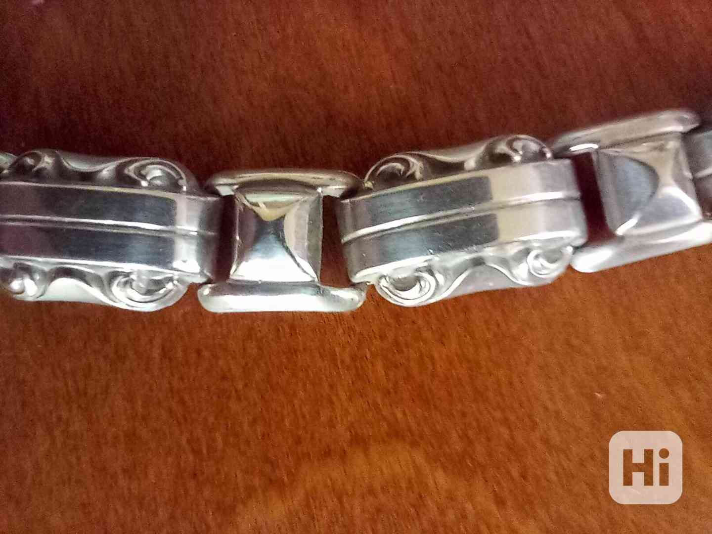 Prvorepublikový stříbrný článkový náramek . Délka 19 cm, šířka 1,2 cm, zasouvací zapínání, ryzost 900/1000, platný punc - slov. trojúhelník, váha viz foto. Bezvadný stav - neopotřebovaný, dárková krabička. Os. předání Praha 2, možné i zásilkovnou za 89.- Kč.