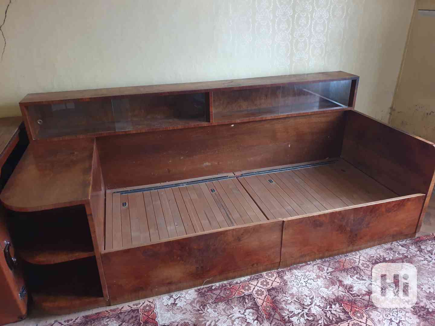 Nabízím k prodeji rozkládací postel pro dva s úložnými prostory, skříňkou na klíč, policemi a knihovnou.