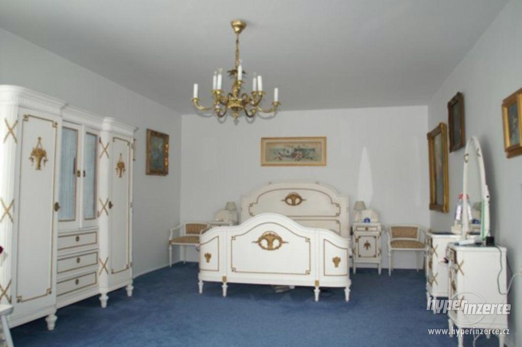 Sestava nábytku do ložnice. Ve velmi dobrém stavu. Sestava obsahuje postel, dva noční stolky, toaletní stolek s velkým zrcadlem, dvě židle a skříň. Odvoz vlastní . Jen pro vážné zájemce.