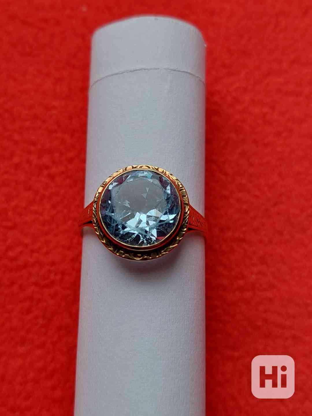 Zlatý prsten s topasem. Hmotnost 2,9 gramu, ryzost 14 karátů, puncováno. Velikost 13 mm, průměr návleku 18 mm.
