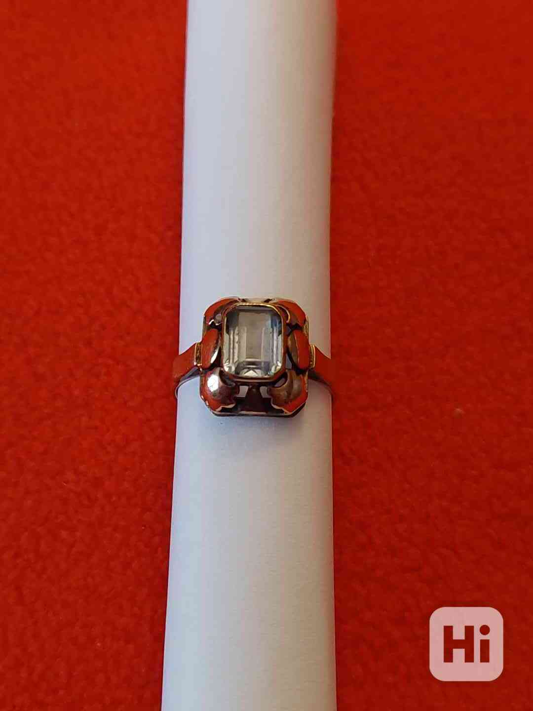 Zlatý prsten s obdélníkovým topasem. Hmotnost 3,2 gramu, ryzost 14 karátů, puncováno. Velikost 12 mm, průměr návleku 17 mm.