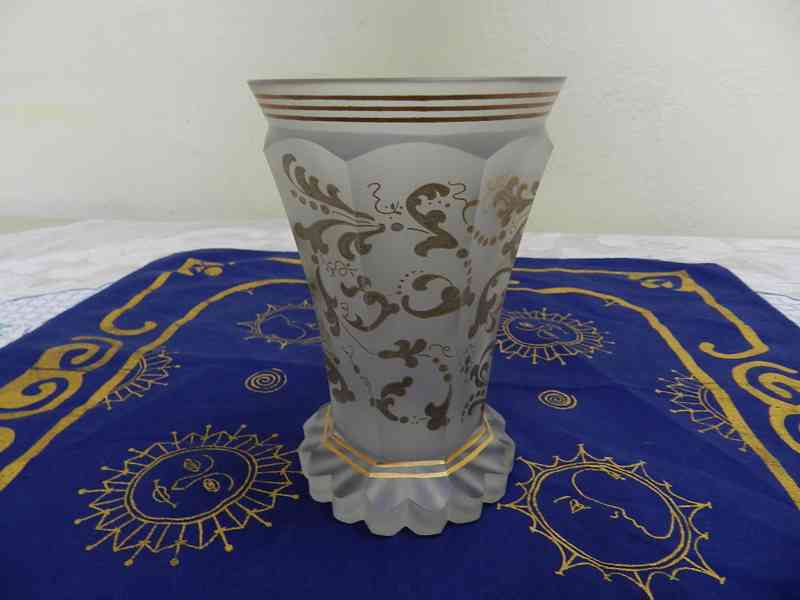 Bohatě broušené a zlatem dekorované sklo elegantní a stylový tvar.