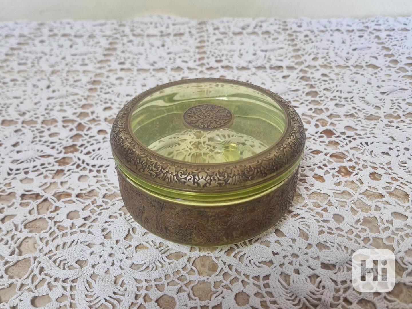 Luxusní uranová dóza s oroplastikou - Moser Karlovy Vary, 20 stol.Rozměry: výška 7,5cm, 12,5cm.Fotky jsou bohužel špatné, moc světlé, dóza je ve skutečnosti tmavší.