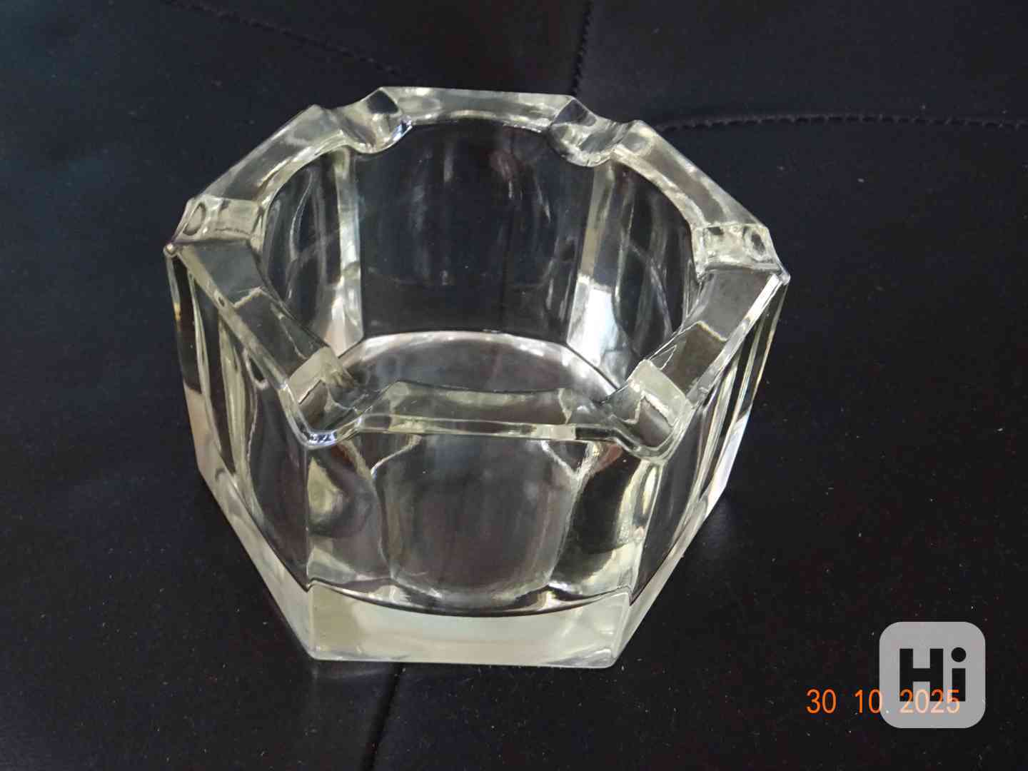 Nabízím starý, šestihranný popelník z olovnatého skla. Váha 41dkg, průměr 7cm, výška 5,5cm. Cca 30.léta.