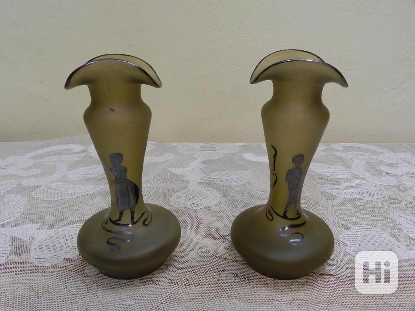 Krásné secesní párové Vázy zdobené stříbrem - Čechy, kolem 1900, nečištěno.Rozměry: výška 18,5cm, průměr 9,5cm.