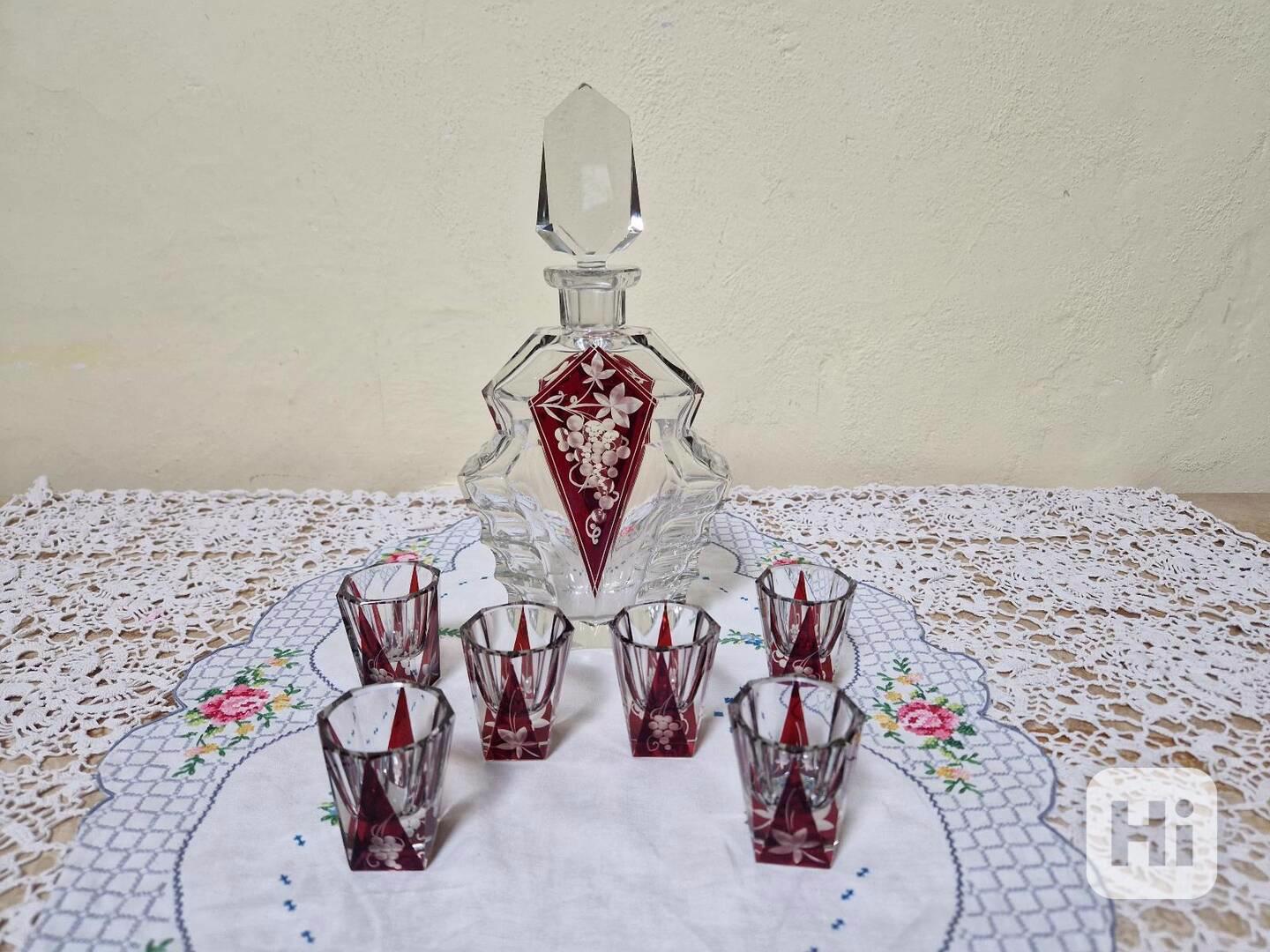 Luxusní broušená Art Deco souprava,Karafa a 6 panáků, čiré broušené sklo, rubínová lazura - Čechy, 1 třetina 20 stol.