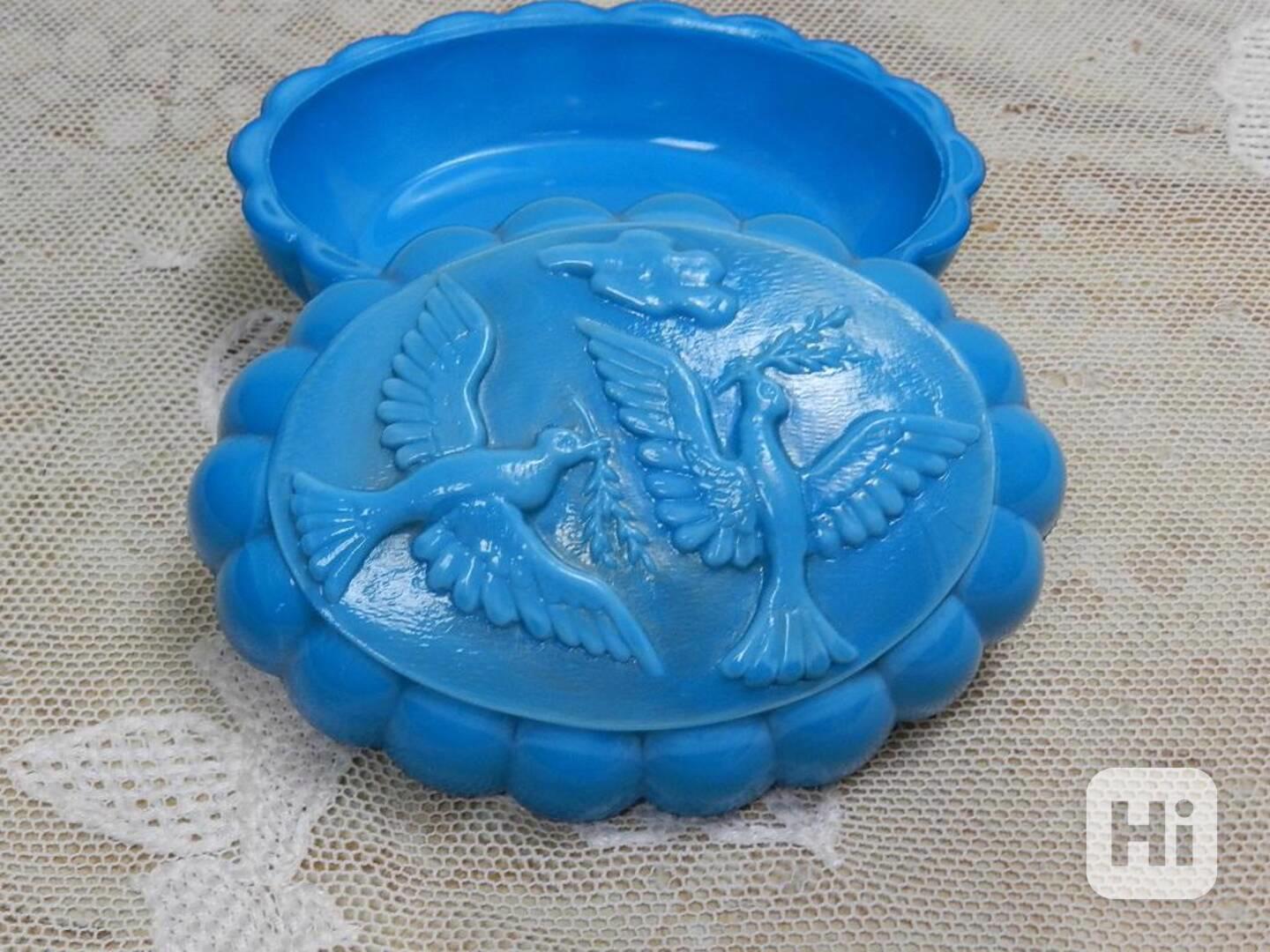 Hezká modrá oválná Dóza s Holubicemi, plastický reliéf, 1 pol. 20 stol.