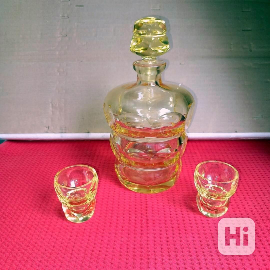 Skleněná karafa Moser Art Deco s fazetami, broušenou zátkou a dvěma skleničkami, neznačeno, obsah 0,5 l, výška se zátkou 21 cm, (bez zátky 16 cm), skleničky v=5,5 cm, Ø 4,5 cm, bez poškození.